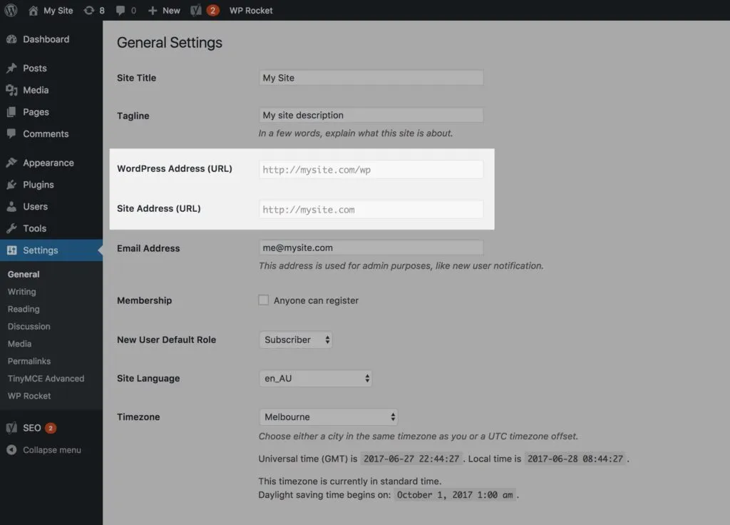 If you are reading this, you are likely in a position where you are unable to edit the WordPress Address and Site Address fields in your WordPress admin;